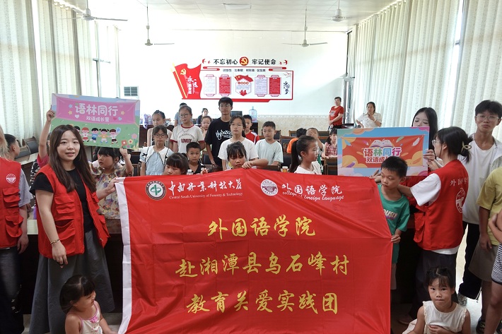 7月15日上午,我院赴湘潭乌石峰村教育关爱实践团在湘潭县乌石峰村村部举办“语林同行”双语成长营开营仪式。此次活动系校地深化协同合作、赋能乡村教育振兴的重要实践,实践团服务队全体成员以双语教学、红色文化宣讲等为载体,为当地青少年提供精准化教育关爱服务。