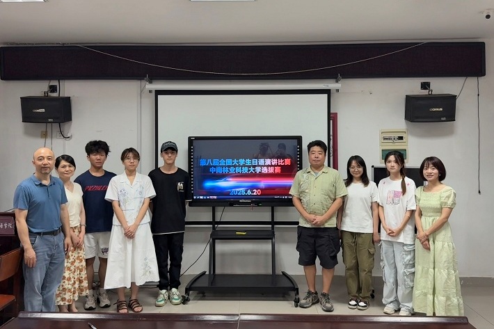 2025年6月20日,第八届全国大学生日语演讲比赛我校选拔赛在知语楼102B举行。大赛主题围绕“AI时代所需的人类核心能力”展开。来自法学院、家居与艺术设计学院、风景园林学院等行政管理、产品设计、工业设计和建筑学专业的同学参加了角逐。比赛中,选手们慷慨激昂,分别通过自己独到的视角用日语分享了对AI时代所需的人类能力的思考。来自法学院23级行政管理专业马昊龙在比赛中表现突出,荣获校赛一等奖;家居与设计学院24级产品设计专业刘佳丽、24级工业设计专业刘乐怡荣获二等奖;24级产品设计专业梁婉君、24建筑学专业周伟康荣获三等奖。赛后日语外籍教师青木诚史郎老师进行了精彩点评。