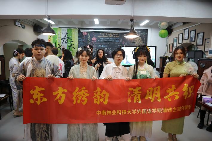 2025年4月1日晚,中南林业科技大学红楼五语学术交流中心内诗意盎然、绣影摇曳,外国语学院湘绣主题创新团队主办的"东方绣韵·清明共织"主题文化活动在此成功举办。来自日本、摩洛哥等十一个国家的二十二名国际学院留学生与中国师生通过文化讲堂、艺术展演与非遗体验,在传统与现代的交融中感受中华文化魅力,于互动实践中深化文明互鉴。