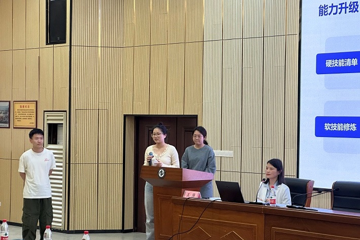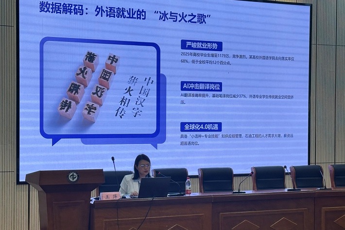 互动环节中,王主任邀请学生参与就业模拟演练,引导学生深入践行“语言+”理念:针对日语专业学生,她建议通过“日语+动漫角色”对接日漫产业;针对朝鲜语专业,她鼓励“朝鲜语+国际贸易”切入外贸领域;同时鼓励学生尝试“语言+金融/教育/科技”等多元路径,拓宽就业路径。谈及当前“中美关税战下外语人择业问题”,她指出美国加税倒逼中国企业转型升级,建议外语人开拓非洲等新兴市场。