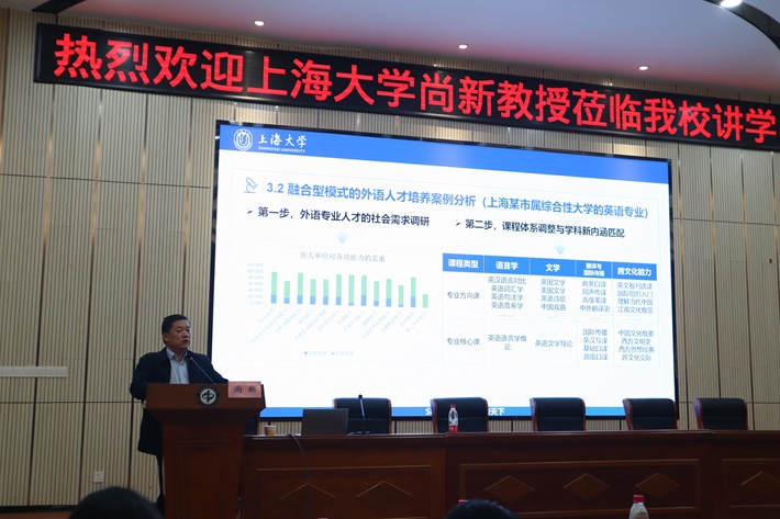 讲座伊始,尚教授回顾了外语专业人才培养经历了从传统的单一型培养模式到复合型培养1.0模式、复合型培养2.0模式的变迁,并指出现有模式在适应新时代人才培养需求方面存在诸多不足。为了应对现存的问题,他创造性地提出了“融合型人才培养模式”,强调通过把外语学习和其他学科领域相结合,引入其他学科的知识、方法和技能,培养具有综合性素养、卓越创新能力的“大外语”人才。同时,为了验证这一模式的可行性,尚教授以上海大学外国语学院为例介绍了在实施融合型人才培养模式的过程中,学院对外语专业人才的社会需求进行了充分调研,并基于调研结果调整了课程体系,使其与学科内涵相匹配,更好地服务于人才培养目标。