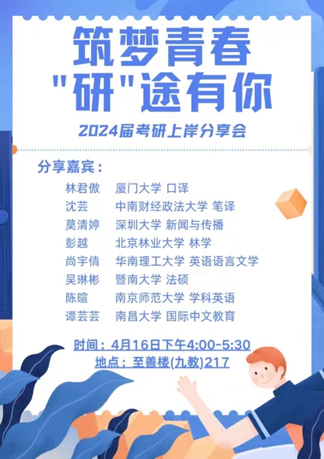 4月16日下午,我院于至善楼217教室为2021级同学举办“筑梦青春,‘研’途有你”考研经验分享会。本次会议由王慧英、李广践老师组织,周泓蓉同学主持,共邀请了8位2020级翻译专业和英语专业的同学进行分享。