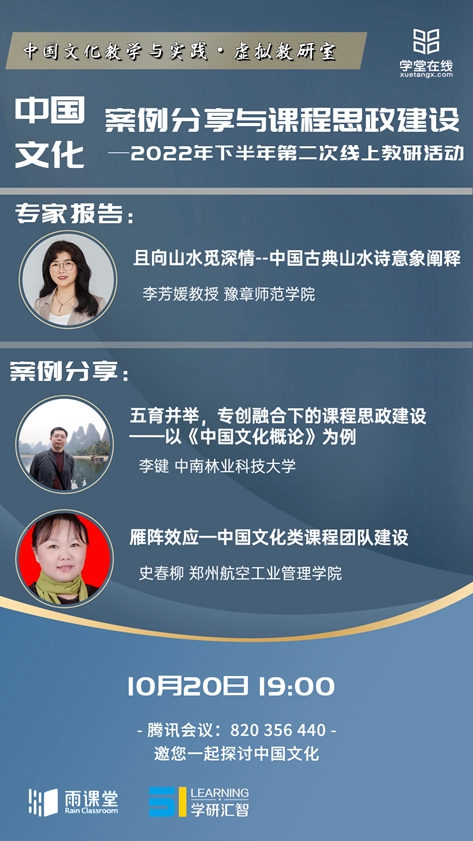 10月20日晚,“中国文化教学与实践”虚拟教研室迎来下半年第二次云研讨,研讨主题为“中国文化案例分享与课程思政建设”。