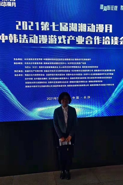 11月23日,由中共湖南省党委宣传部、中国国际贸易促进委员会湖南省分会、湖南省文化旅游厅共同主办,中共长沙市委宣传部、湖南省贸促会国际交流中心、长沙市文化旅游广电局等单位承办,湖南动漫产业协会、韩国文化内容授权协会、大韩贸易振兴公社共同协办的“2021第七届湖湘动漫月中韩法动漫游戏产业合作洽谈会”在长沙举行。我院朝鲜语系教师、湖南省韩国文化研究与交流中心研究员周禧玲应邀担任此次洽谈会中韩翻译工作。