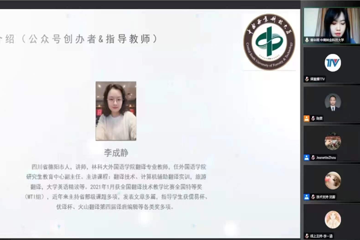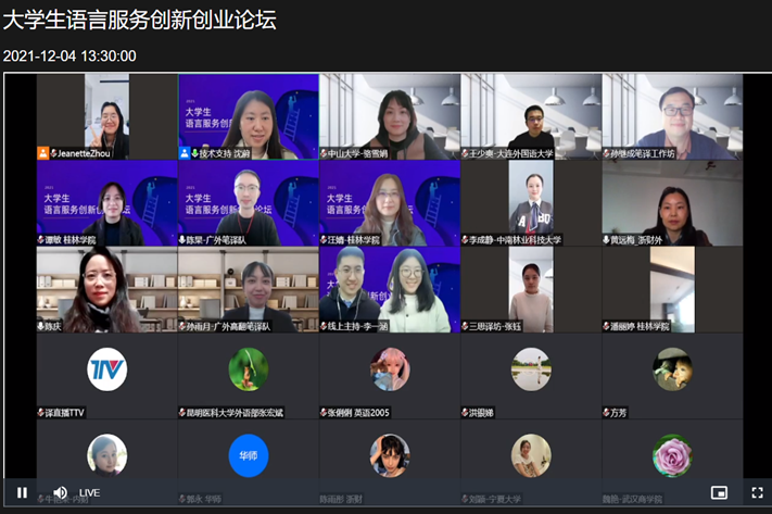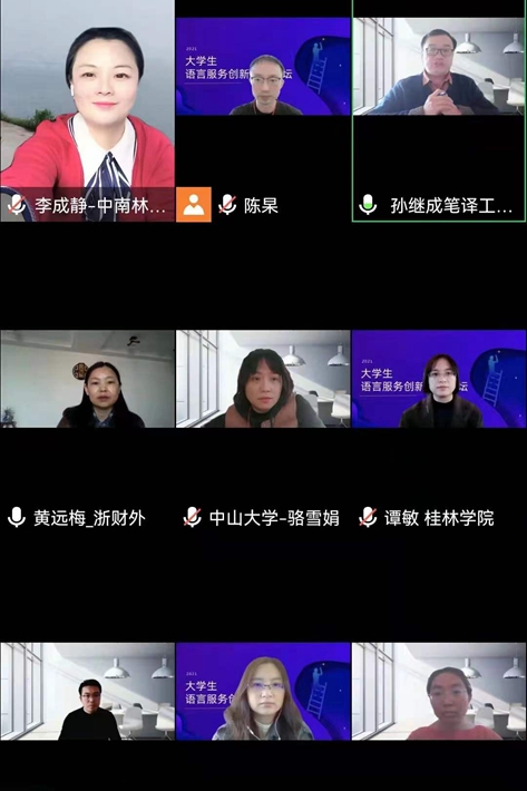 12月4日,我院青年教师李成静和其指导学生裴辛桐、张铃、王书鲲代表学校参加首届大学生语言服务创新创业论坛。本次论坛由大学生语言服务创新创业联盟(筹)和广东外语外贸大学高级翻译学院创新创业实践训练基地联合主办,通过译直播平台线上直播,旨在促进语言类专业大学生创新创业,推动经验交流,为拟组建创新创业团队的院校提供参考。