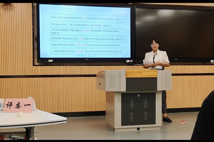 本次比赛由湖南省教育厅主办,旨在提高全省普通高校教师课程思政教学能力,使专业课与思政理论课同向同行,形成协同效应,实现“立德树人”的教育根本任务。前期经各院校推荐选拔,共有52所高校的301件参赛作品入围复赛,其中外语类作品93件;经专家评审,最终有39个外语类教学团队(个人)进入决赛(大学英语组21个,专业英语组18个)。外语类赛道环节,参赛选手被要求在赛前1.5小时现场抽取比赛素材,现场制作PPT并以英文进行10分钟现场说课、5分钟课堂教学展示以及5分钟现场提问。重点考察参赛选手提炼课程育人元素并将其有机融入专业知识传授的能力,从而体现出价值引领、专业素养和教学特色。
