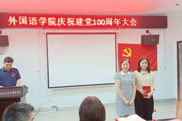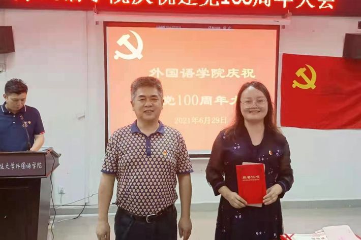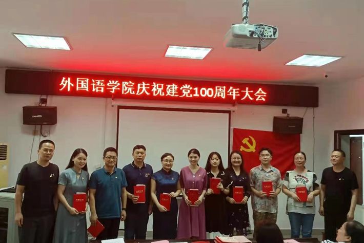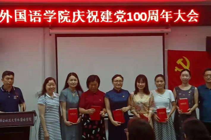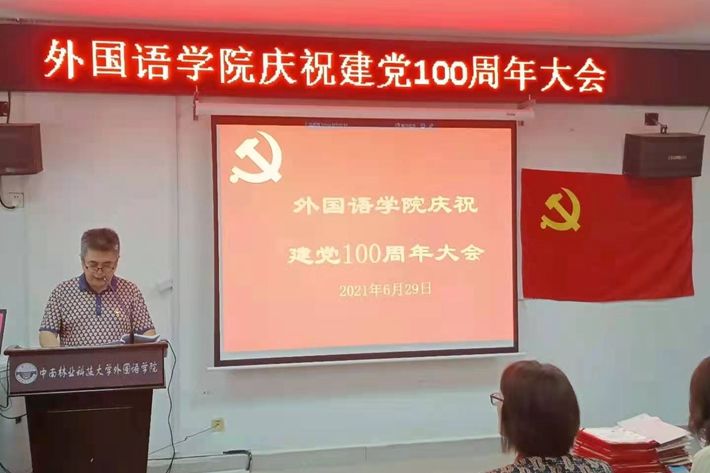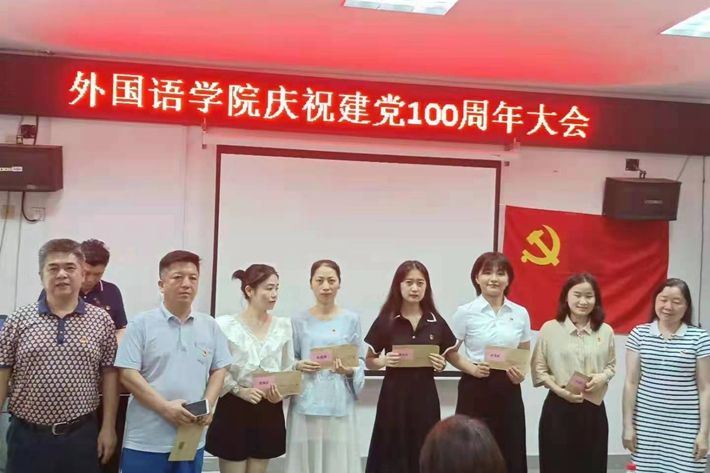 庆祝建党100年,起航时代新征程。6月29日,外国语学院党委在知语楼102隆重举行庆祝建党100周年大会。会议由党委副书记张学兵主持,党委书记李鹏飞讲话,院长张沉香宣读表彰决定,学院全体教工党员以及获奖学生党员参加。
