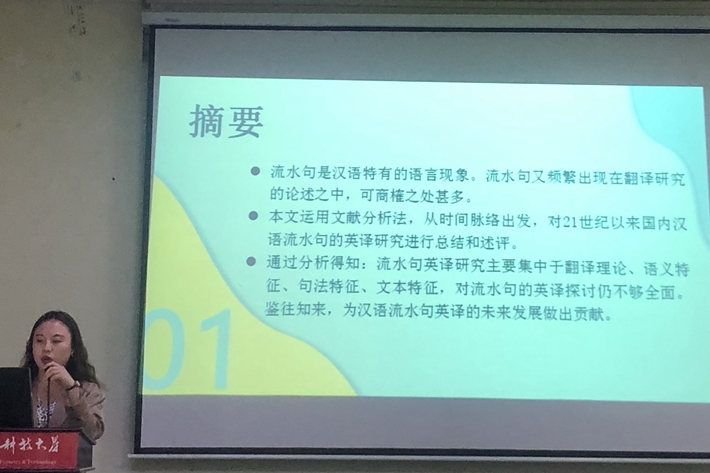 刘颖同学分享的是《21世纪以来汉语流水句英译的研究综述》,她运用了文献分析法,从时间脉络出发,对21世纪以来国内汉语流水句的英译研究进行总结和述评,并通过分析得知:流水句英译研究主要集中于翻译理论、语义特征、句法特征、文本特征,对流水句的英译探讨仍不够全面,以期为汉语流水句英译的未来发展做出贡献。