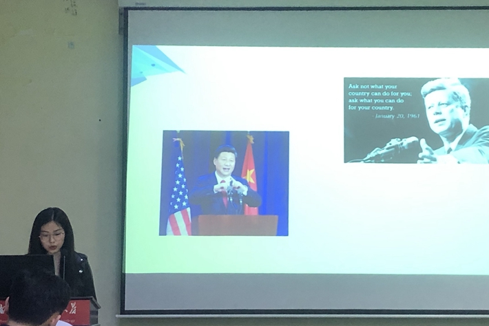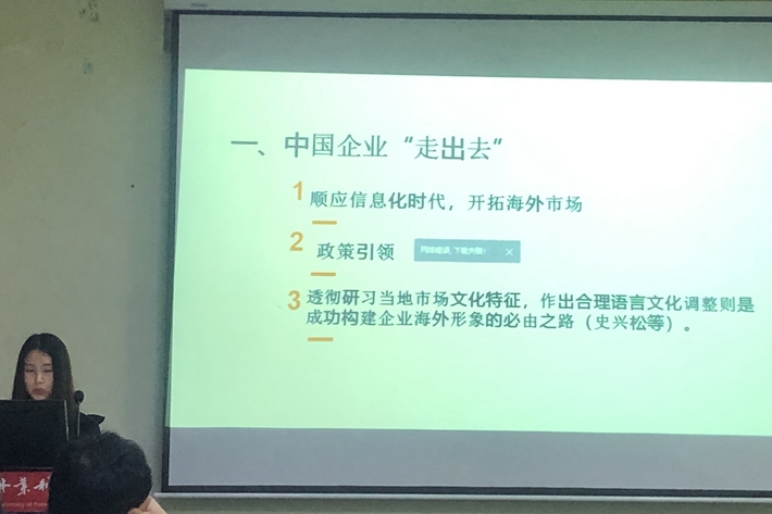 曾茹慧同学分享的是《文本类型理论视角下演讲文本的翻译》,她提出以赖斯文本类型理论为指导,以习近平主席的演讲为对象进行研究分析,通过具体翻译过程的检验,认为在翻译演讲文本时以赖斯文本类型理论为标准确定翻译策略可以使翻译过程更流畅,得到更好的译文。