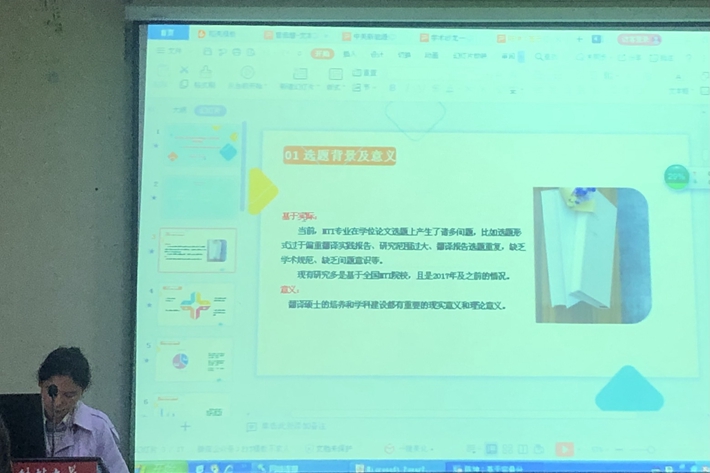 陈坤同学分享的是《基于定量分析的农林院校MTI学位论文选题研究——以330篇英语笔译方向学位论文为例》,她基于8所农林院校330篇翻译硕士学位论文选题的定量分析,归纳出农林类院校论文选题的共性,从而总结出选题所具备的特征。