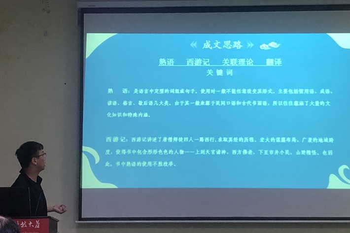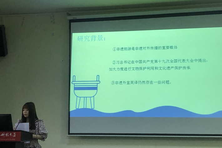 吴孟杰同学强调了非物质文化遗产的重要性,以及如何结合生态翻译学理论指导翻译工作。从语言、文化、交际三个维度对典型的非遗旅游外宣英译文本进行研究,最终来提升译文的可读性。