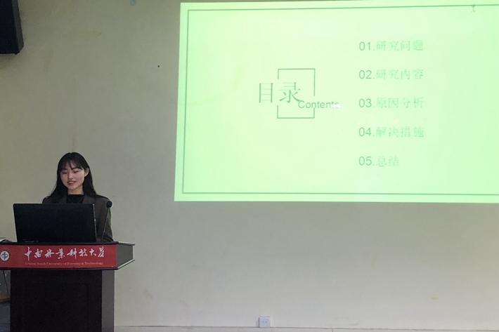 第二位主讲人是郑迎香同学。她强调了口译学员在英汉交替传译过程中存在的问题,并进行归类、分析,最后提出了自己的建议和对策。通过问卷调查的形式,进行定量分析,在认知负荷模型的指导下分析漏译的成因,提出了解决方法,旨在进一步提高口译译员的翻译质量和能力。文中指出,口译译员在今后的学习和工作中,要注重听辨能力的提高、笔记法的熟练程度,同时,也要注意脑记和笔记的平衡。最后还强调了译前准备工作的重要性。