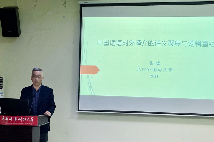 4月12日晚,北京外国语大学博士生导师张威教授应邀在至善楼217教室为我院做题为“中国话语对外译介的语义聚焦与逻辑重组”的学术讲座。讲座由我院副院长李志奇主持,部分教师和翻译专业研究生、本科生聆听了讲座。