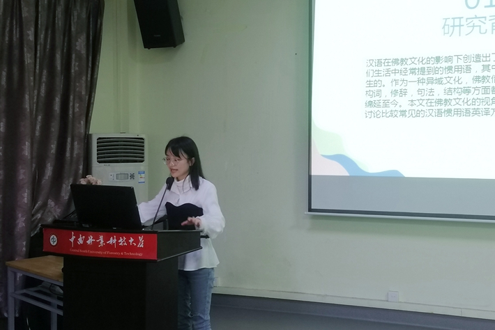 第三位主讲人是喻海红同学,针对汉语中有关佛教用语的问题进行了探讨。汉语在佛教文化的影响下创造出了许多丰富多彩的语言形式,人们生活中经常提到的惯用语,其中一部分就是在佛教的影响下产生的。作为一种异域文化,佛教借助佛经为传播媒介,对汉语的构词,修辞,句法,结构等方面都产生了巨大的冲击。这种影响绵延至今。本文在佛教文化的视角下,从汉语惯用语的英译着手,讨论比较常见的汉语惯用语英译方法。