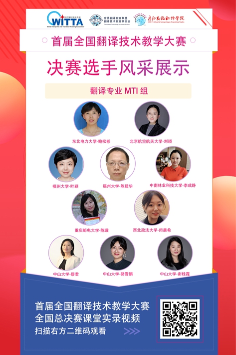 本次大赛由全国翻译专业学位研究生教育指导委员会、世界翻译教育联盟翻译技术教育研究会(WITTA TTES)与广东外语外贸大学高翻学院翻译技术教育与研究中心联合主办,是首次全国性的翻译技术教学大赛。大赛设东北、华北、华南、华中、华东、西南、西北7个赛区,各赛区一等奖选手获得全国总决赛参赛资格。总决赛分MTI组、BTI组和非翻译专业组三个类别,选手须提交15分钟的课堂实录视频、完整课程教学大纲,并进行7分钟线上说课、3分钟答辩。参加初赛的选手共计300多名,总决赛选手22组,整个大赛历时四个多月,竞争十分激烈。