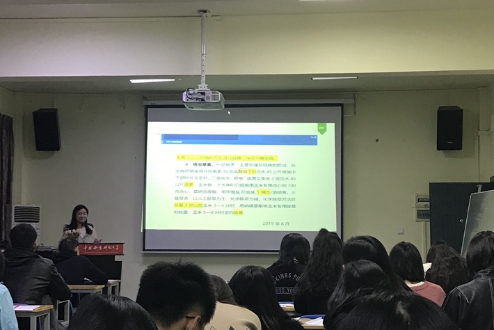 第三位主讲人马杏的主题是:农业知识讲解稿翻译实践报告。基于2019年袁隆平农业高科技股份有限公司国际培训学院组织的援外农业技术培训班赴湖南湘西外出考察学习玉米规模化生产经验期间专家实地讲解稿的中英翻译实践,她汇报了翻译的全过程,包括客户要求、译前准备、翻译过程等,重点分析了汉英翻译中专业词汇、句子翻译处理方法,并对此次翻译实践进行了总结。