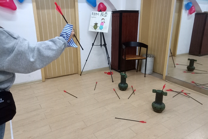 同学们在玩韩国传统民俗游戏--投壶