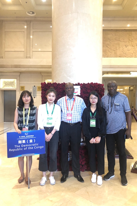 法语系16级学生何芷茹与王靖雯同刚果(金)与会代表合影