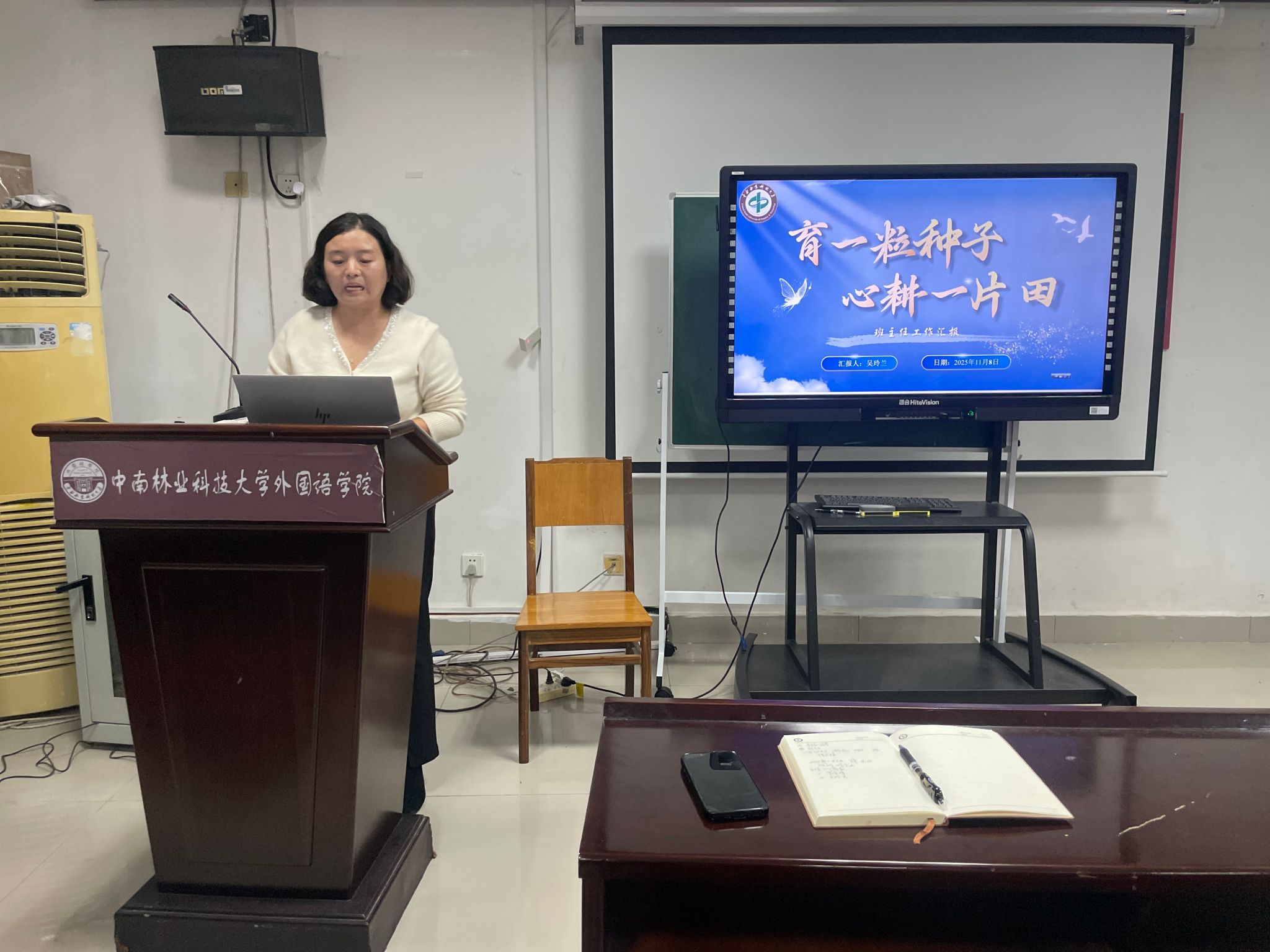 在经验交流环节,优秀班主任代表吴老师分享了班级管理的实践与成效。她围绕“专业知识与新时代技能使命相结合”的理念,通过专题讲座、典型案例等形式,从思想、学业、认知、实践四个维度引导学生成长,积极推行“翻译+X”综合能力培养模式,有效衔接学生职业发展。她还注重发挥团支部作用,鼓励学生投身志愿服务,弘扬奉献精神。在其带领下,班级建设成果显著:所有课程及专业考核通过率达100%,英语专业四级考试通过率100%,平均绩点达80.4;荣获各级学科竞赛奖项27项,6人获评奖学金,成功申报国家级创新创业项目并发表省级论文3篇,班级获评校级“十佳班集体”称号。吴老师也坦诚剖析了自身在深入了解学生、课堂跟踪指导及竞赛辅导方面存在的不足,展现出求真务实的工作作风。