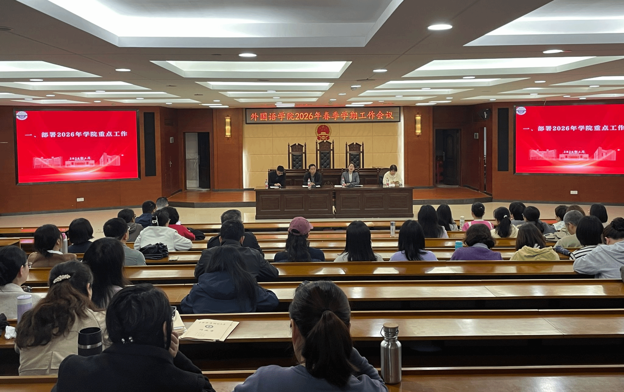 4月7日,我院在模拟法庭召开春季学期工作会议,全面部署新学期重点任务,动员全院上下统一思想、锚定目标、狠抓落实,推动学院各项工作高质量发展。学院党委书记曾晓峰主持会议,何敏副院长(主持工作)作工作部署,全院教职工参加会议。