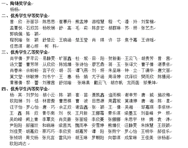 根据学校下达给我院的评奖评优指标,结合学校有关文件精神,经个人申请、班级推荐、学院奖助学金评定小组审定,按照公平公正公开的原则,拟推荐以下班级、同学参评。现予以公示,公示期为2023年10月24日至2023年10月31日。如有异议,请本人或实名撰写书面材料反馈至外国语学院学生工作办公室(知语楼104)各年级辅导员处,电话:0731-85623272。