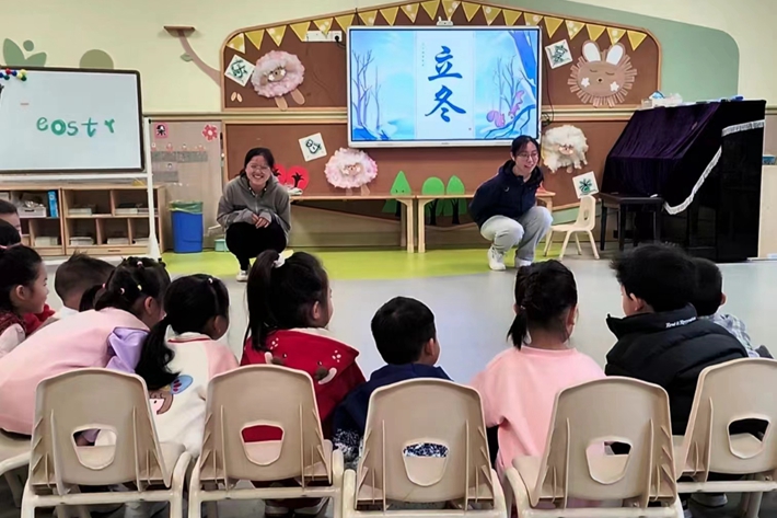 “现在小朋友们注意老师的口令,当听到‘立’字的时候,小朋友们就站立起来,当听到‘冬’字的时候就蹲下去。好,那我们一起开始吧!”随着常译尹、何芊两位老师“立——起;冬——蹲”的口令,这个节气课堂的热身小游戏一下让新力•紫园幼儿园中班的小朋友牢牢记住了“立冬”两个字。