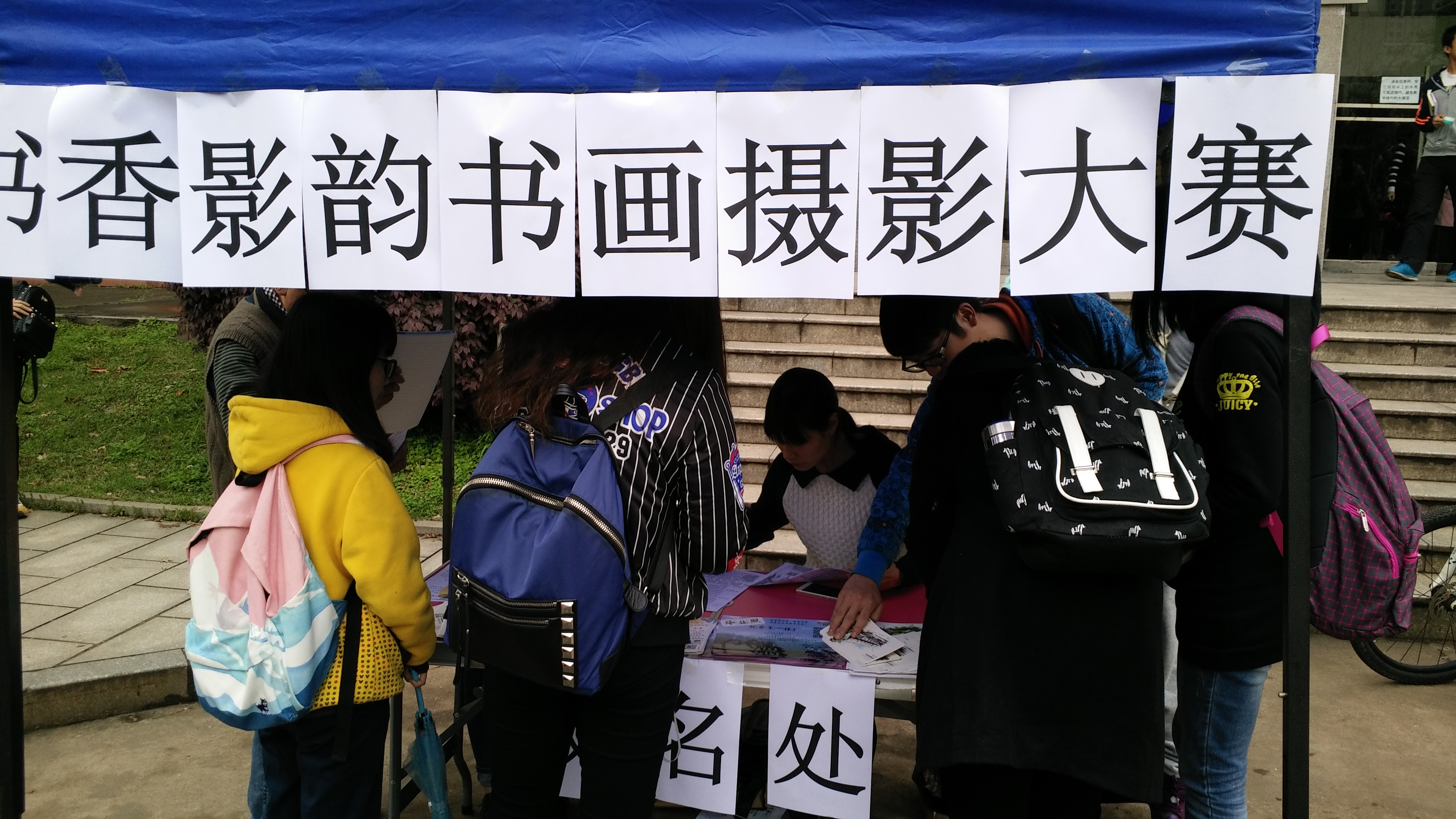 2016年4月6日,由外国语学院主办,团委宣传部承办的“书香影韵”2016书画摄影大赛正式拉开帷幕。6日至8日,摆点宣传活动在七教和一食堂前同步进行,现场咨询与报名的人络绎不绝。