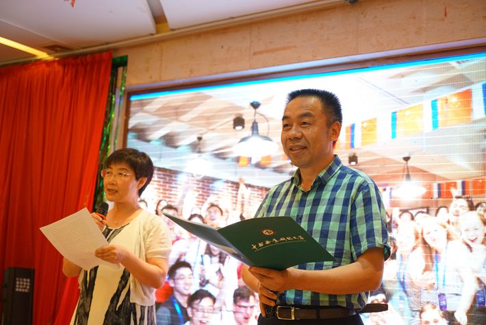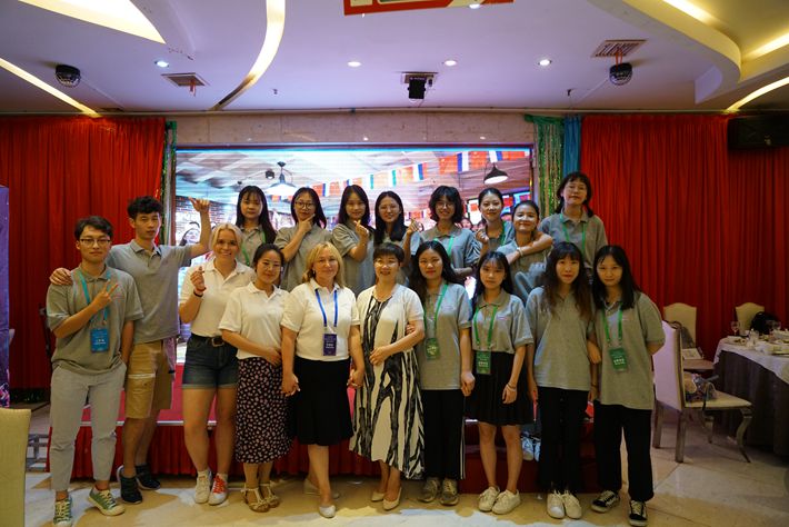 闭营仪式上志愿者与俄语系主任王润华、带队刘薇玮老师及俄方领队合影