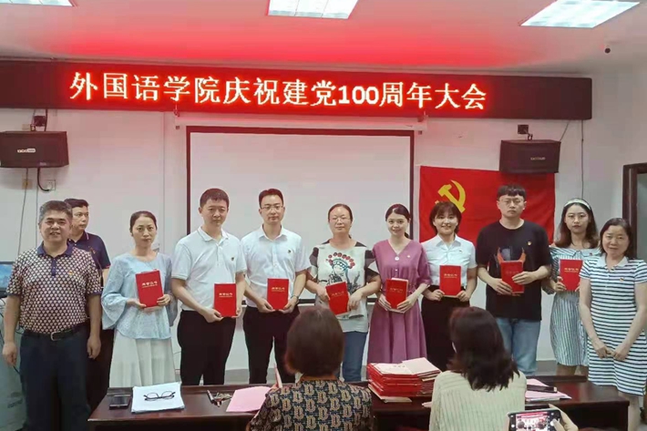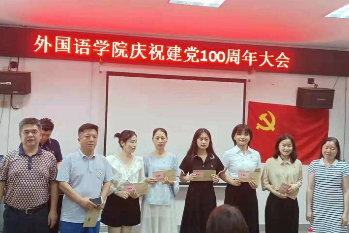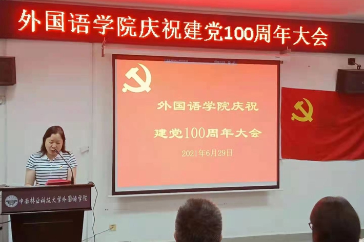 庆祝建党100年,起航时代新征程。629日,外国语学院党委在知语楼102隆重举行庆祝建党100周年大会。会议由党委副书记张学兵主持,党委书记李鹏飞讲话,院长张沉香宣读表彰决定,学院全体教工党员以及获奖学生党员参加。