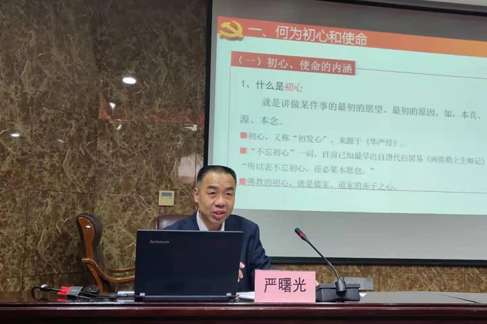 严曙光从何为初心和使命、中国共产党的初心和使命、坚定信念跟党走等三个方面进行了深刻的阐述,为大家上了一堂生动的党课。他从初心和使命的内涵出发,娓娓道来,分析了不同政党、不同个人的初心和使命,讲述了什么是中国共产党的初心和使命、指出了为什么要不忘初心、牢记使命以及怎样才能不忘初心、不辱使命,强调大家要坚定理想信念,加强党性修养,永远跟党走,要以“不忘初心、牢记使命”主题教育专题学习为契机,深刻学习习近平新时代中国特色社会主义思想,用习近平新时代中国特色社会主义思想武装头脑、指导实践、推动工作,在干事创业中找方法、寻路子,努力练就新本领、学会新功夫,主动作为,不断谱写新篇章。