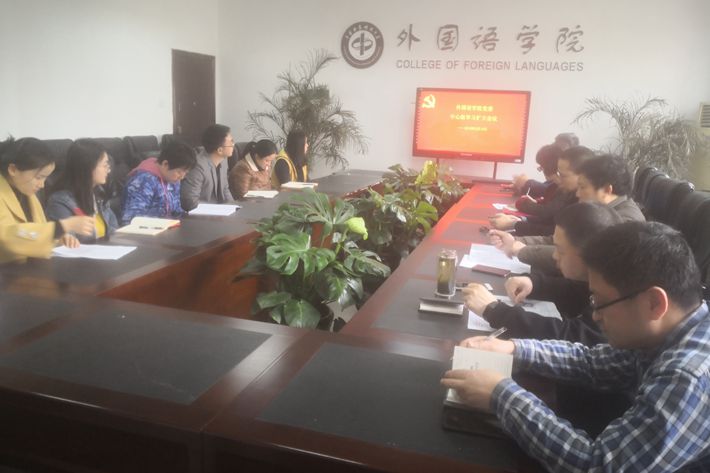 3月19下午,我院党委在知语楼二楼会议室召开学院中心组学习扩大会议。参加学习的成员有学院党委班子成员、行政党支部党员、科级干部,会议由党委书记李鹏飞主持。
