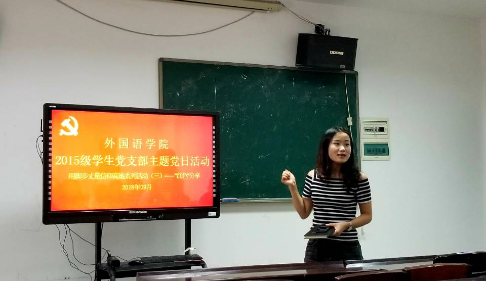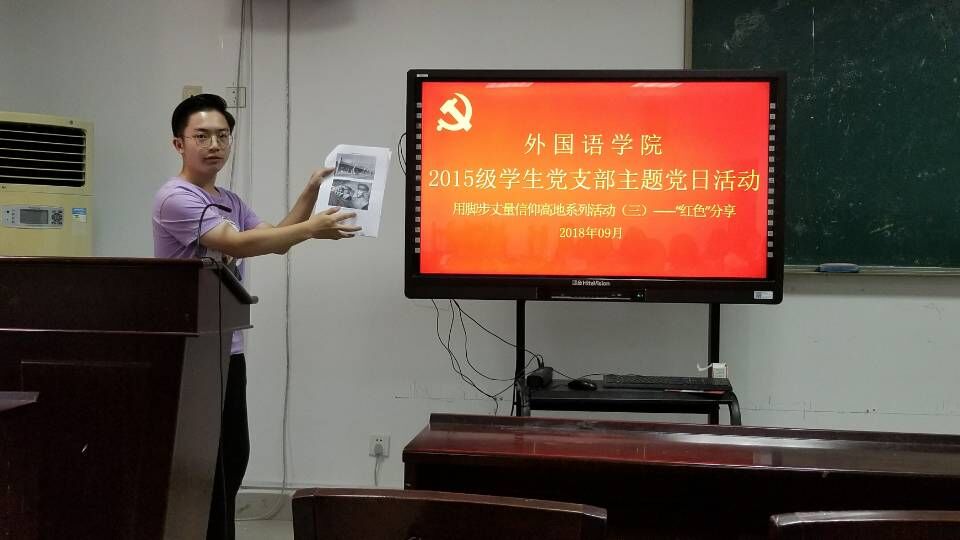 9月11日下午,外国语学院2015级学生党支部开展了用脚步丈量信仰高地系列活动之“红色”分享主题党日活动。活动内容主要是党员分享暑期参观红色基地或观看红色文学的经历及感想,共收集了47份材料。支部书记刘媚主持此次活动,2015级学生党支部全体成员参加。