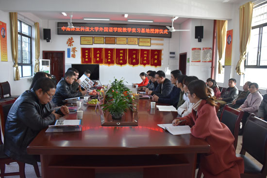 12月26日,我院教育实习基地授牌仪式及交流会在浏阳市泮春中学举行。会议由泮春中学支部书记罗湘源主持,龙伏镇政府副镇长肖许兵、我院书记李鹏飞、副院长李端阳、副院长李志奇、泮春中学全体行政人员和英语教研组全体成员参加了会议。