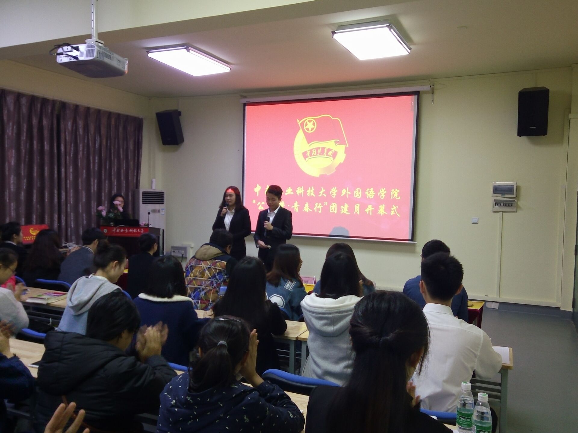 在整齐嘹亮的中国共产主义青年团团歌声中,此次团建月开幕式拉开了帷幕。首先,我院2015级各班团支书对各自的班级概况、班委构成、班团活动以及团建月目标作了简短演讲,由此也展示了各班的特色。其中,英语三班提出的“未来不闲置”的口号让人为之振奋,朝鲜语一班“乐观又不失认真”的态度也让人眼前一亮。日语二班也不逊色,“宥于一班,珍惜记忆与陪伴”的班级寄语正体现了这一个整体的团队精神。法语一班和二班高度注重公益事业,他们珍惜着每一个献爱心的机会并相信相遇是命运的馈赠,正如两个俄语班级团支书所言,我们相聚是一场美丽的际遇,“薄年相伴勿相忘”。最后由庞铭老师为此次开幕式致辞,她强调了公益的重要性,并用她的亲身感悟来号召同学们参与公益事业。