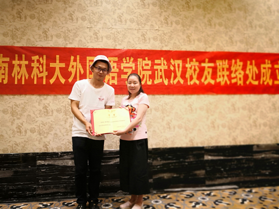 7月7日,外国语学院武汉校友联络处成立大会在武汉隆重举行,外国语学院院长张沉香,副院长、院校友办主任黄宇驰,院校友办副主任刘一波老师参加本次的成立大会。